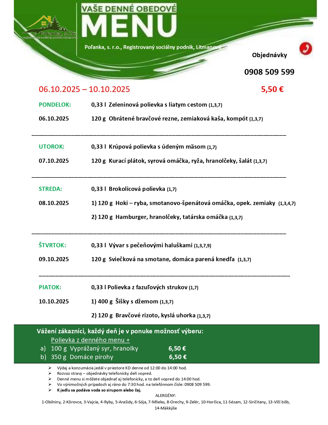 Denné obedové menu 06.10.2025 - 10.10.2025