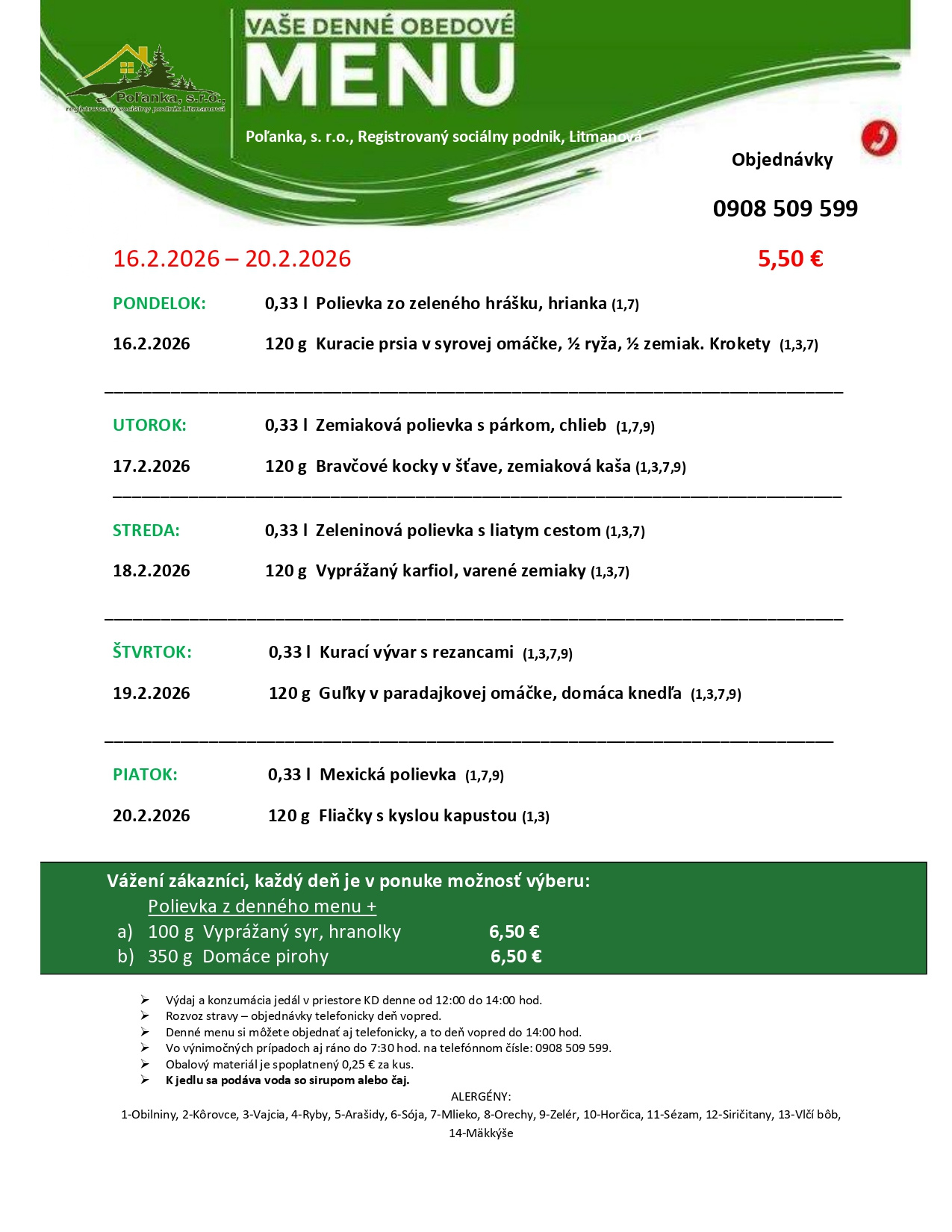 Denné obedové menu 16.02.2026 - 20.02.2026