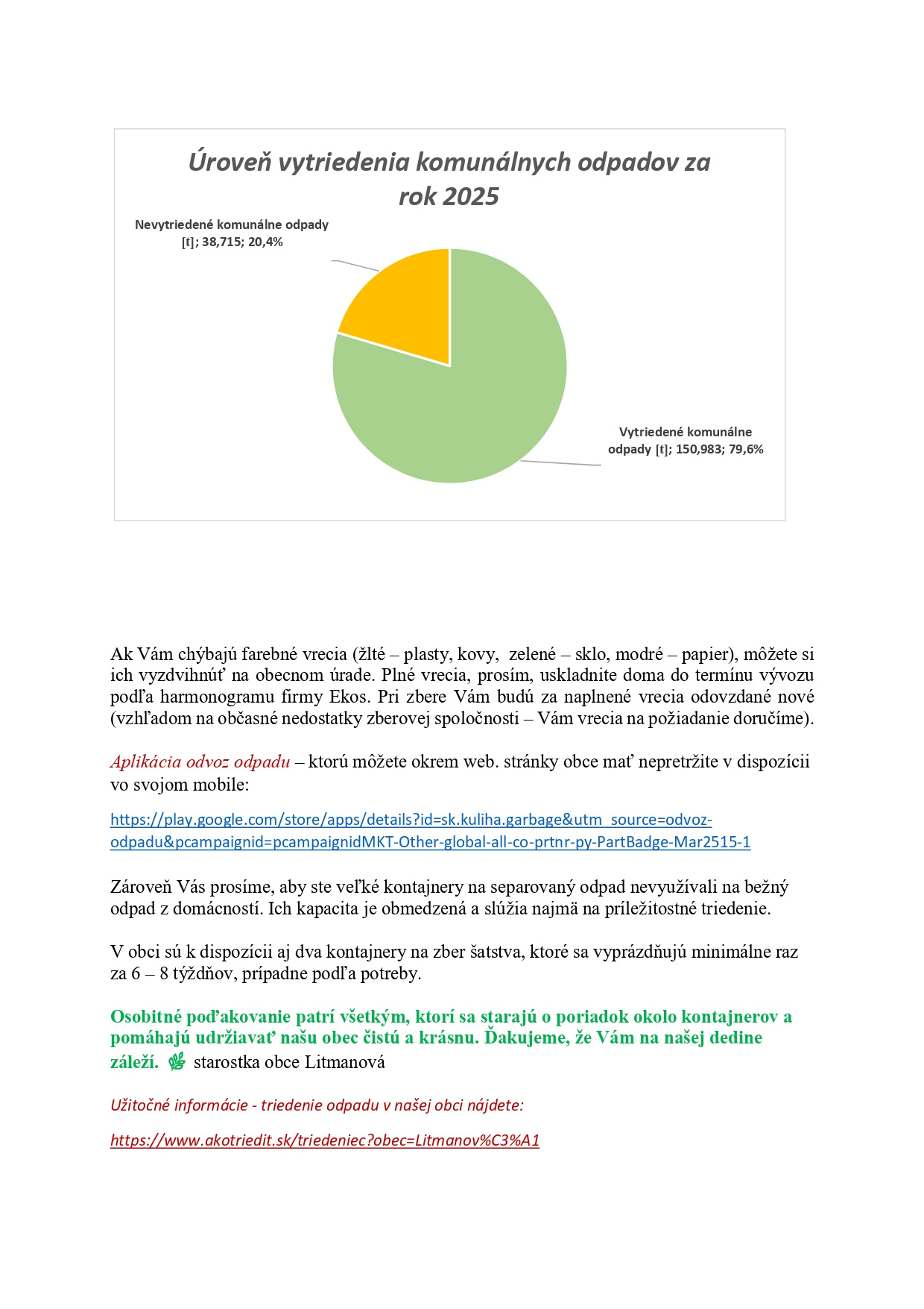 Informácia o úrovni triedenia komunálneho odpadu v obci Litmanová za roky 2018 - 2025