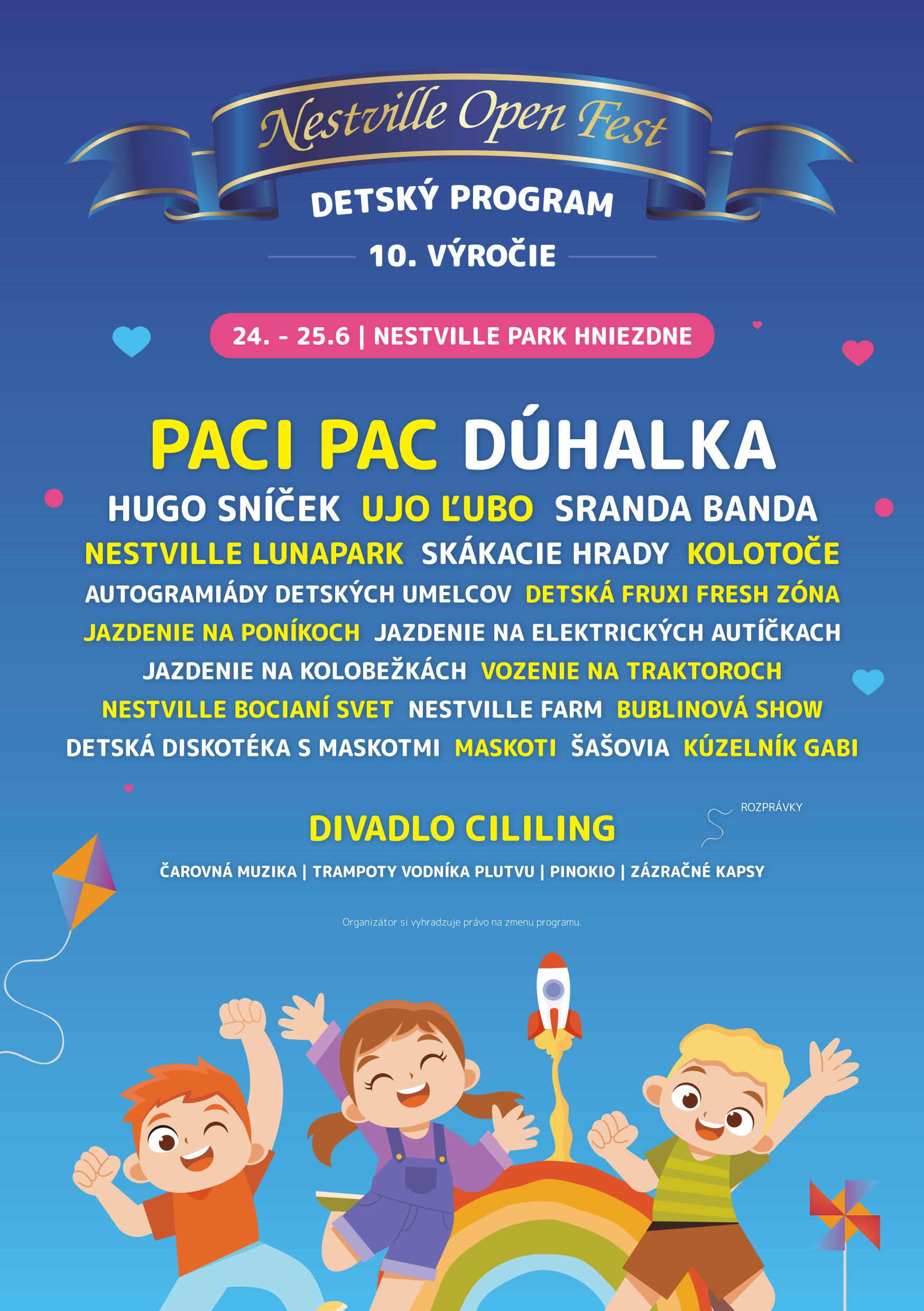 Súčasťou podujatia bude aj pestrý detský program, kde sa vaše ratolesti môžu tešiť na dva dni dobrodružstva s Dúhalkou, Hugom Sníčkom a zoskupením Paci Pac. Nestville Park toho však pre najmenších skrýva omnoho viac a radosť sa bude rozdávať aj vo Fruxi Fresh zóne, v bociaňom svete, v Nestville Farm, na traktoroch, poníkoch, autíčkach a vlastne všade kde to len bude možné.