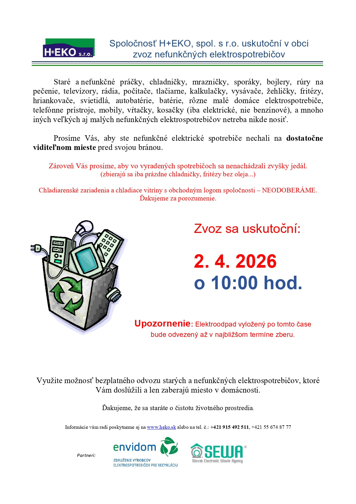 Spoločnosť H+EKO, spol. s r.o. uskutoční v obci zvoz nefunkčných elektrospotrebičov - 02.04.2026 o 10:00 hod.